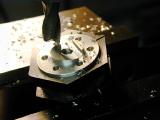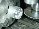This rather dark shot shows the special shop-made radiusing tool used to finish the head to the drawing spec. The tool (seen better in the next photo) is a three flute cutter with a 1/8" radius turned in before gnashing with an end mill. The ends of the teeth are relieved with a swiss file before hardening and tempering. Finally, the cutting faces were touched up in the Quorn, but a hand held Dremel tool could probably have been used, with care, to achieve the same result.
