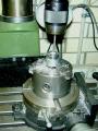 Now the table is oriented vertically, with the bolt holes aligned "fore-aft", per the drawing, for fin-slitting. A 1/16" slitting saw is mounted and brought down to touch the top of the head. The Z axis is zeroed, then lowered by a distance of one half the sum of the head diameter and cutter thickness. At this point (as seen here), the Z axis is re-zeroed. All cuts will now be plus or minus from this datum.
