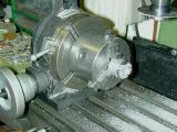 All heads were turned from a length of 6061 bar stock, cut to be long enough for each head, a bandsaw cut, plus a little. In anticipation for a major stuff-up, the bar was cut long enough for four heads (been there before, I have). That done, it was a convenient size to hold in the 3 jaw self-centering chuck without tailstock support. Fisrt operation is center-drill, face the end, then finish turn to the required head diameter for the total height, plus the bandsaw cut, plus about 0.020". The end of the finish area will then be used to align the stock in the saw for parting-off. That done, the edge profile is formed. Here we see a 45 degree chamfer has been cut, and a radiused form tool is about to be plunged in.