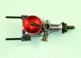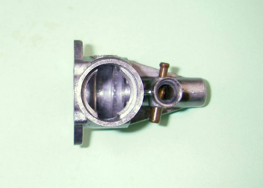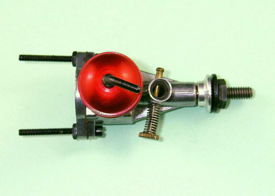 The intake venturi was cast in unit with the crankcase and main bearing. In typical American 1/2-A fashion for the day, the brass spraybar was simply pressed into the transverse hole provided for it across the venturi. The spraybar was internally threaded 1-72 to accommodate a hard brass needle having an integrally-machined serrated disc at its outer end for control purposes. The needle was very effectively tensioned using a simple coil spring.