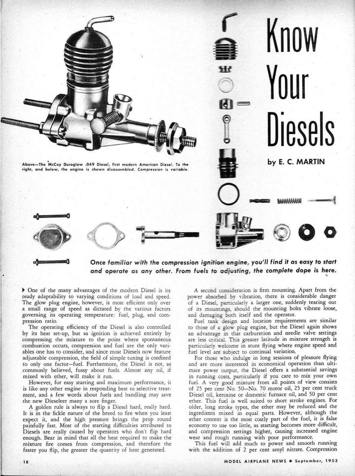In his test report, Martin did as much as he could to encourage American modellers to give diesel engines a try. His "oily-hands" advocacy didn't stop with this test—the September 1953 issue of Model Airplane News carried a most informative article by Martin entitled "Know Your Diesels" in which he went into even greater detail regarding the mysteries of diesel operation. The McCoy Duro-Glo .049 diesel was featured as the heading illustration for this article, although the sectional view of a "typical diesel" on the second page shows Martin's famous AMCO 3.5 BB design, an engine almost completely replicated as the MAN 19, a machine-from-solid DIY project by Martin for MAN which commenced in the April 1956 issue.