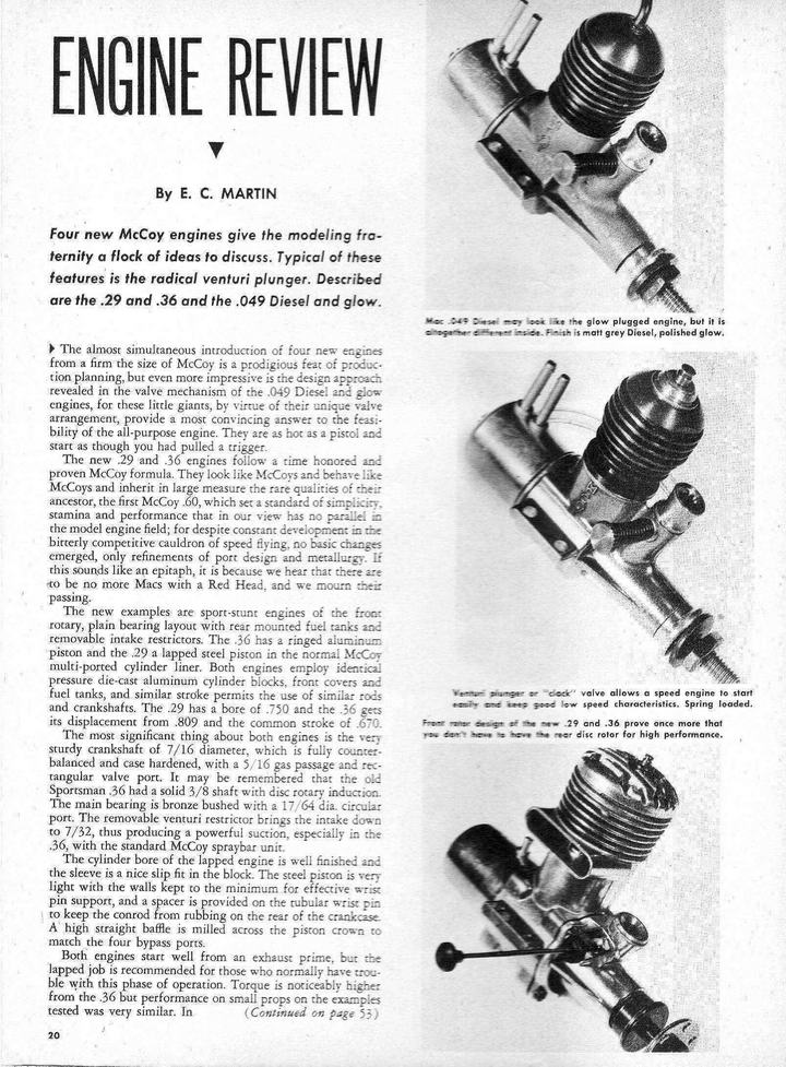 Unusually, this test report covered no fewer than four distinct McCoy models which had then recently been released. In addition to the McCoy .049D, these included the companion McCoy .049 glow model as well as the .29 cuin and .36 cuin "Super Stunt" models. In actual fact, the two McCoy .049 models covered in this test had been released in 1954, as had the McCoy 29 "Super Stunt" model. The only really recent release covered by this article was the short-lived 36 "Super Stunt" model. It appears from this that the reported testing had taken place over a considerable period of time.