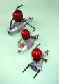The glow-plug version of the McCoy .049 had an appearance which was at first glance quite similar to that of the diesel version described earlier. However, it featured a completely redesigned Cox-influenced cylinder using twin opposed rectangular exhaust ports with twin internal transfer flutes between them. To accommodate the revised porting, the engines used a steel con-rod with a ball-and-socket small end bearing to eliminate any possibility of a gudgeon pin fouling a port.