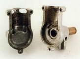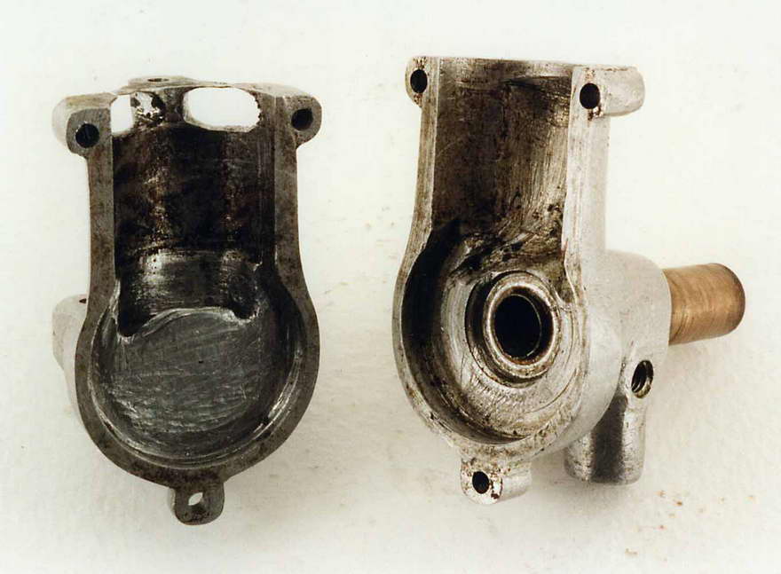 Internally, there is machining only where necessary, and this appears to have been restricted to simple turning. There is no evidence of any milling, but there are marks which would indicate that general metal removal, and in particular the shaping of the transfer passage, has been achieved by chiseling, filing and scraping. The case is aluminium, so hand working would not be difficult. Remember, this guy was a sculptor, so that is hardly surprising.