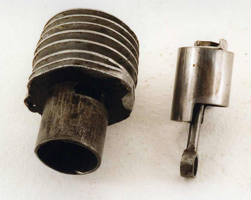 The positioning of the ports in the cylinder give rise to an odd piston shape. In order to get normal exhaust and transfer event timing, the depth of the piston skirt at the rear of the engine is considerably lower than at the front of the engine. A curved passage has been carved into the rear of the case to give clearance at bottom dead centre for this very low piston skirt extension. This sculpture can be seen in the previous photograph.