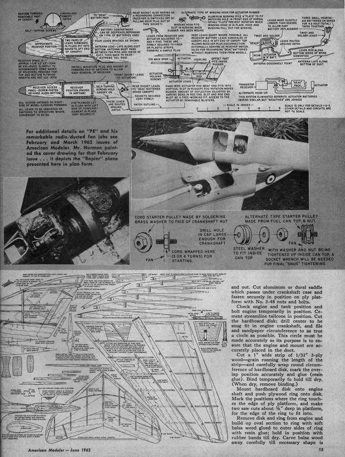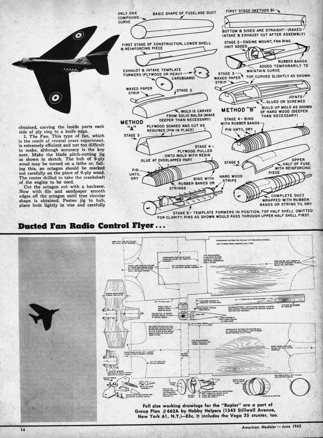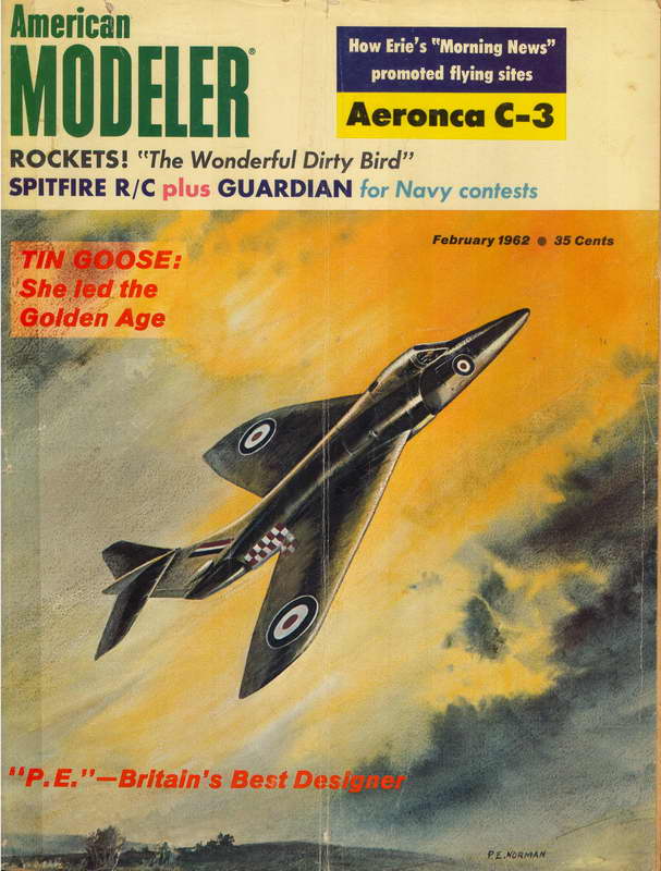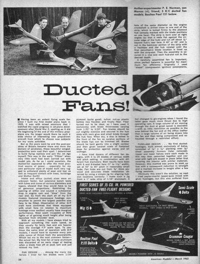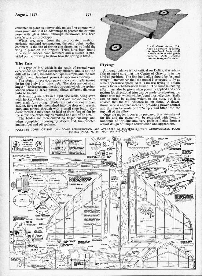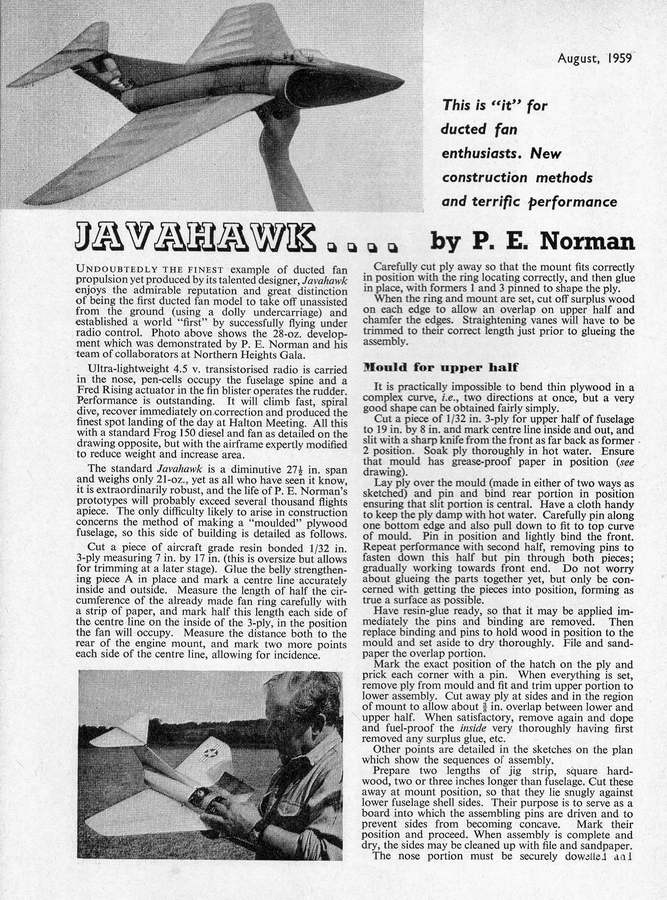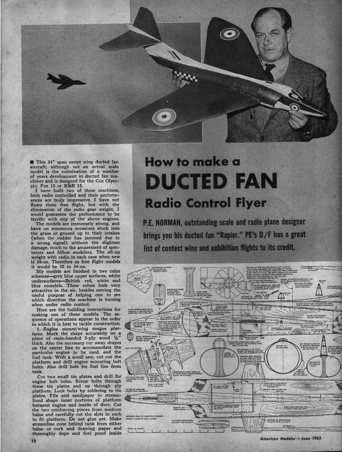 PE was well known for his pioneering efforts with ducted fan propulsion for models. These include the Mig 15, plans for which appeared in the Aeromodeller Annual 1955-56, his free-flight Javahawk which featured in the Aeromodeller, August 1959, and the single channel R/C Rapier that appeared in the June 1962 issue of American Modeler. Smaller all-sheet variations of the Javahawk for free-flight called the Shrike and Mini-delta, designed in collaboration with Bill Dean, appeared in American Modeller, November/December 1964.