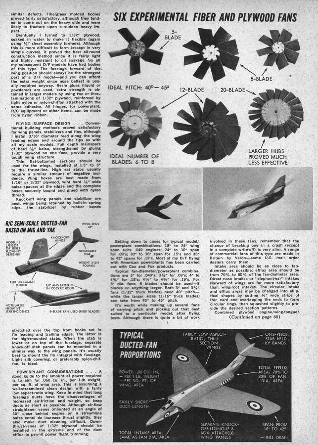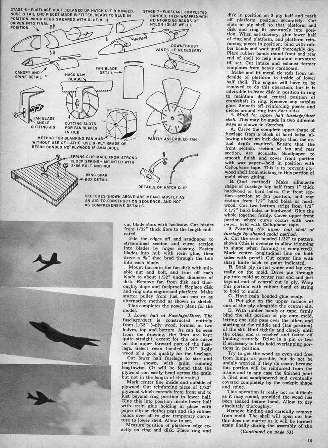 As might be expected from a violin maker, his ducted fan models had shapely fuselages modelled from steamed and twisted balsa and plywood sheet bonded together in the most incredible way. Ducted fan was always a bit iffy in the early days and few modellers have built his designs for this form of power.