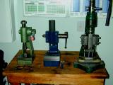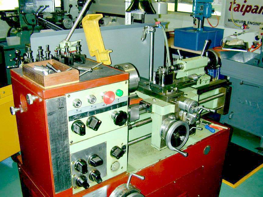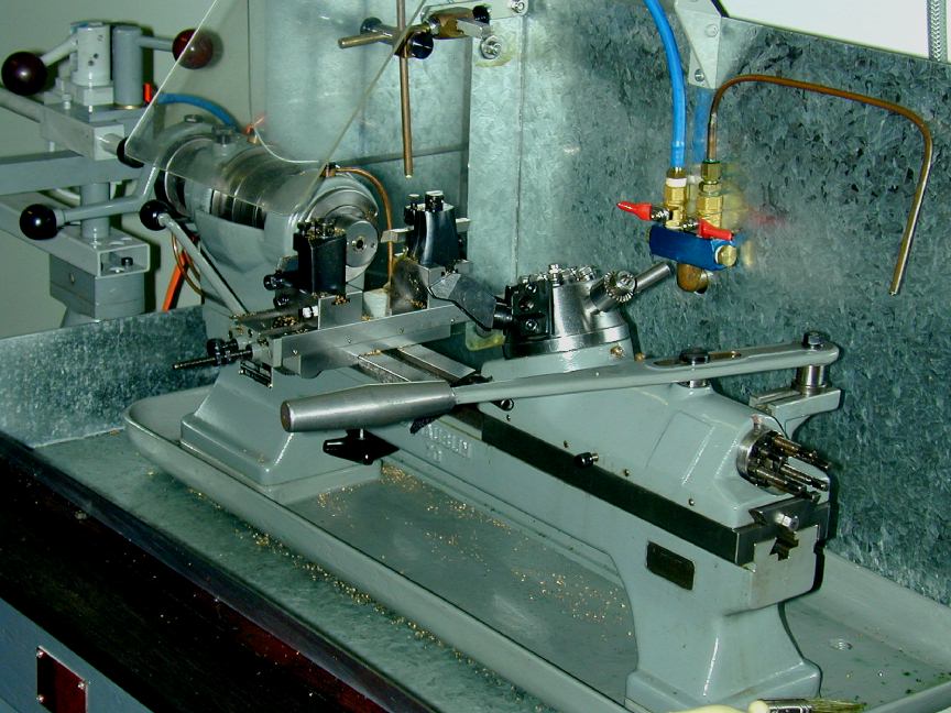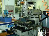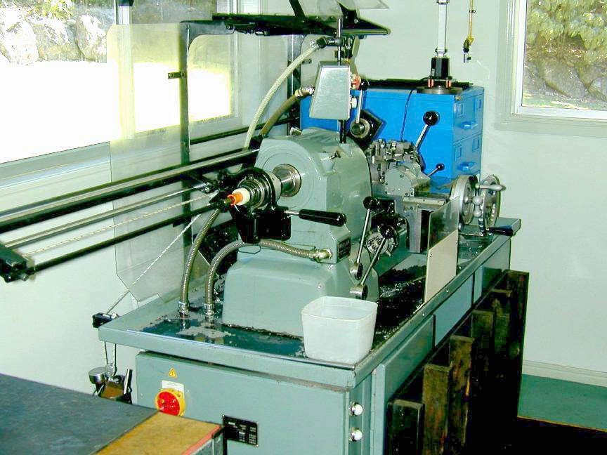 Where to start describing Peter's shop? First, it's roomy, with large glass windows around two sides that provide great natural lighting from Peter's garden that abruptly changes to bushland, being situated just below the crest of what Ozzies would call a mountain range and other would call hills. In the center of the shop is a cluster comprising mill, tool-room lathe, external grinder, and surface grinder. Grouped around this cluster are two turret lathes: a Swiss Schaublin 70 (Peter's favourite), and a Feeler (which is a good copy of a Hardinge), plus benches, press tools, Sunnen precision hone, and precision drilling machines. An assembly station, come design bench, and generous storage facilities completes the picture. Compressed air is delivered to the machines needing it (like the feed mechanism on the small turret lathe). In fine attention to detail, the air lines are painted yellow with oil/water traps at all outlets. The pictures below show some of the machines.