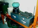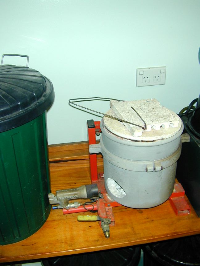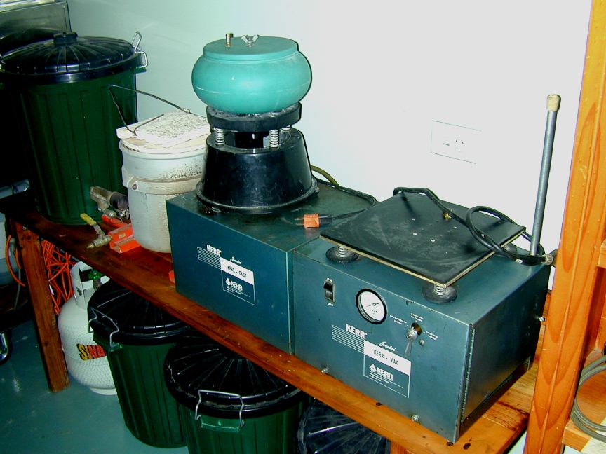 Beside the machine shop is a room that houses the compressor and the lost-wax equipment. Peter does all his own investment die casting using the equipment in the photos below. The casting process is vacuum assisted, depending on the slight porosity of the investment to draw the melt into all the intricate cavities of the case. Peter says this also assists in the removal of air bubbles from the castings. His furnace is gas fired and quite basic, though the pyrometric equipment that he brings to bear on the process, and on the subsequent heat treat process is anything but basic. Still, errors do happen. The odd object d'art being held by Peter here is a cluster of crankcases that got heat-treated at a somewhat high temperature due to a faulty thermo-couple.. Like all craftsmen, Peter keeps such things around to remind himself that bad things happen to the best of us (you should see my reminders!).