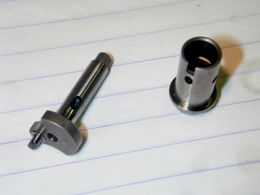 Here is the liner which is a drop in fit in the case. The slot in the liner registers with a 1-72 cap-head screw in the side of the crankcase to correctly align the ports and prevent the liner from rotating. Passages cast into the case at front and aft form the main transfer passages. The anti-rotation screw would block the boost passage, except there isn't one in the conventional sense. Instead, a little channel cast into the bulge above the screw feeds the boost port with mixture fed from a hole in the piston as mentioned before. This also assures that the piston can only be assembled correctly facing one way. The inexperienced often neglect to note which way a piston faced when disassembling an engine and have a 50% chance of reassembling it with the piston facing in a direction that essentially requires the engine be run-in all over again—or more likely, run-out! Look at the finish on he edges of the crank-web, the ground pad at the crank-pin base that prevents the rod rubbing on the web, the oval induction port, and the precisely angled Schnurle ports in the liner. It's like each engine was being made for a model engineering exhibition. The shaft uses a 4-40 screw to mount the prop. The prop driver is keyed by two little flats ground onto the shaft, just visible in this photo.