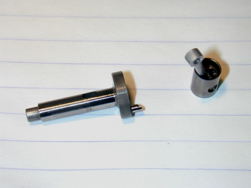 Here is the hardened mild steel steel piston and EN36A nickel steel crankshaft. Just visible if you know where to look is the Schnurle boost transfer port in the piston. This scheme has the theoretical advantage of assuring a flow of relatively cool mixture through the piston during transfer that helps keep the temperature down and assures lubrication of the wrist pin. The wrist pin is just about the only thing on the engine that Peter does not make, rather it is a hardened steel roller. It is pressed into the conrod and freely rotates in the piston. There are light counterbores on the piston wrist pin holes that serve dual purposes. They align the piston in the tooling used while the pin is being inserted, and act as little oil damns to assist lubrication. As we'll see later, the pin insertion tool ensures that there is no possibility of the wrist pin and cylinder liner ever coming into contact with each other. Very cunning. Now look closely at the end of the crankpin. With the pressed in wrist pin and tall crankcase geometry, jiggling the conrod onto the crankpin would be nearly impossible. The little bevel on the pin allows the rod to be rocked easily onto the pin with the shaft at the TDC position. The amount of bearing surface lost is miniscule, and who knows, it may act as an oil reservoir as well. I must remember this trick next time I make more AHCs!