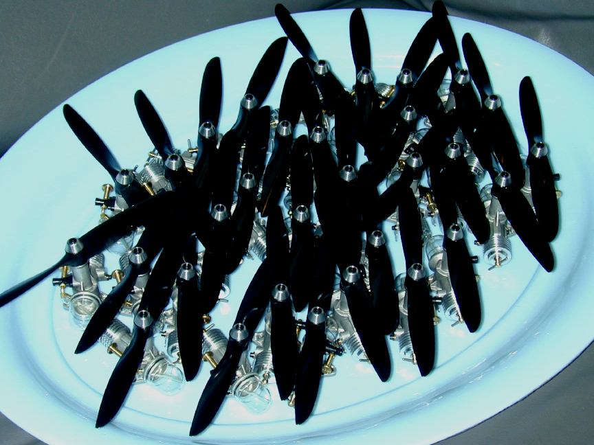 As I write this in late May, 2004, the PB .33 is ready to ship. Here we see a platter of engines ready for test running, and the packaging. Note that each engine comes with two propellers (a 6x3 and a 6x4), a spare fuel tank, O rings, a set of Allen keys, and an extra length of fuel tube. All are packed in a generous foam insert. Operating instructions are on a double sided A4 sheet. The price is admittedly high: A$500, plus shipping. There will be no agents, no bulk deals, and no discounts. Peter knows that many will call this "overpriced", but he has considered what it takes and has taken to build them and priced to make the engine give him a modest return on this time. If the market votes a resounding "no way" to the price, he is quite prepared to make no more of them. If this seems extreme, there is a precedent: he confirmed the story about an entire production run of Taipans being used as fill under the concrete floor of the Adelaide Taipan factory—he should know, as he helped pour the concrete over them! So are they worth it? Well that's up to individuals to decide. The engine is not a beginners' engine—no small diesel is, really. These are engines for the connoisseur and are intended to be flown, not sit in a glass case—though I don't doubt that many will do just that. I have no connection with Peter, or this venture—I'm just another customer who feels that the engine will give me my $500 worth of joy. The rest of the world will make up their own minds and time will tell...
