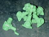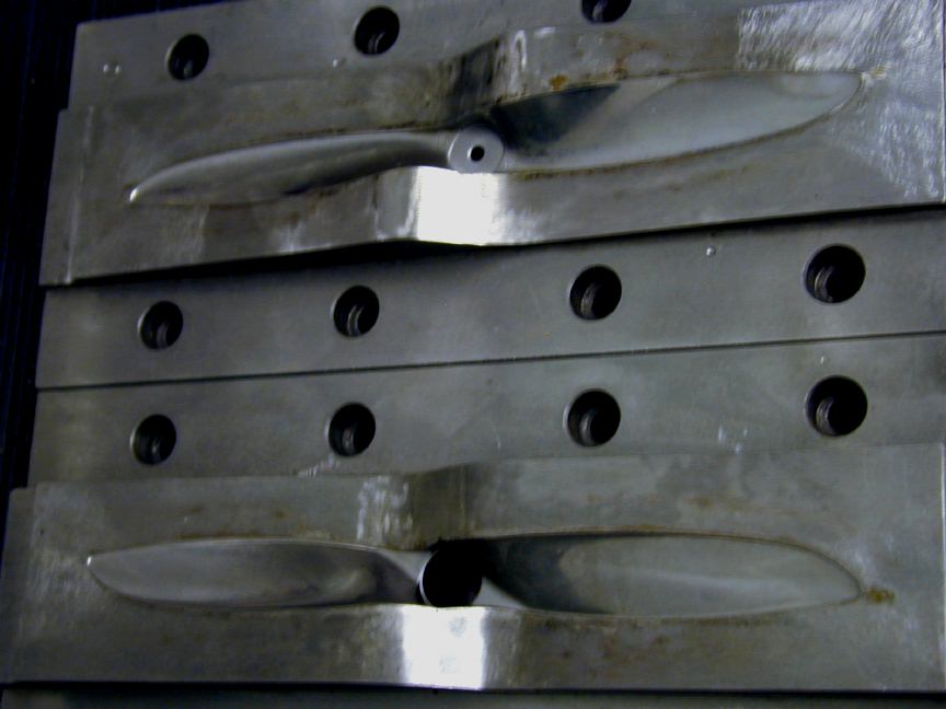 More of the die maker's art. Above, from the left are the die for the fuel tank, the combined venturi and backplate, and on the right, the die for one of the pair of very elegant propellers Peter designed for the 0.33. The prop bears a strong resemblance to the Taipan range of props with wide cuffs reminiscent of the "Larabee" blade form (designed for the highest possible efficiency at the lowest possible speed). Obviously the prop die must separate around the periphery of the blade shape, but what happened in the middle? If you examine commercially moulded props, you can gauge the quality of the dies by how the lower trailing edge meets the higher leading edge of the opposite blade across the side of the hub. Many are a simple vertical step (including the Taipan props of yore). Not infrequently, this will leave a step, or a flash on the prop. Peter wanted his props to be as blemish free as possible, so notice how the TE sweeps elegantly up to the LE. The result is a very attractive and blemish free job. The "roughness" visible at the tip of the die faces is intentional. This provides sufficient passage for air to escape as the glass reinforced polyamide flows in.
