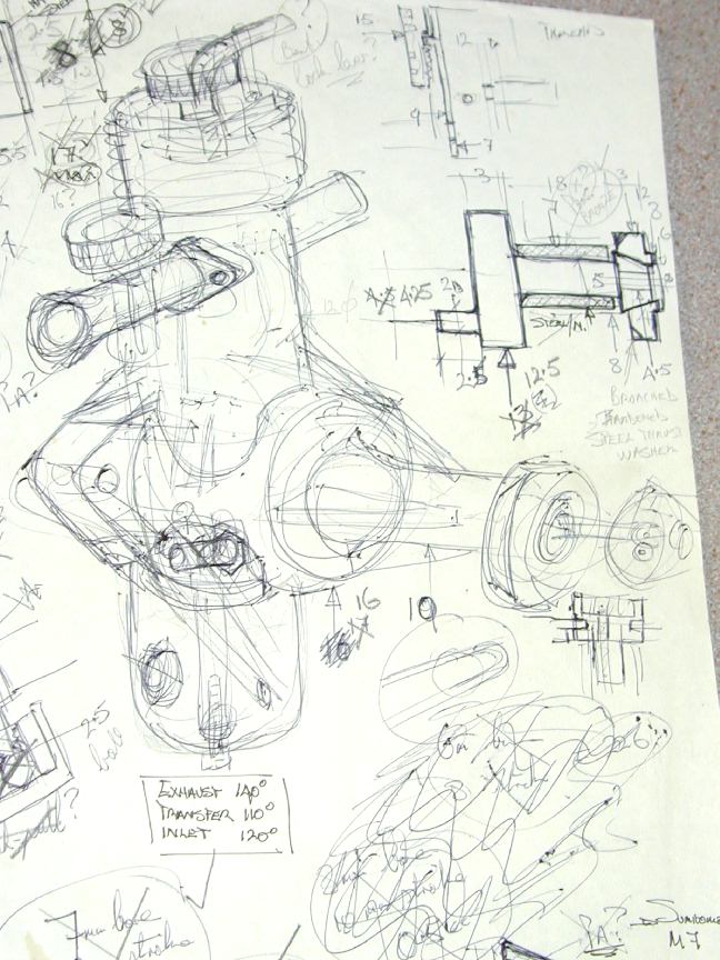 Peter says he is not a modeller, though with Gordon for a father, it was unavoidable for him not to fly small control-liners and other types while growing up. But he does have a modeller's passion for small engines and even though he had been part of the decision that saw Taipan cease manufacture, he retained both the interest and suppressed desire to build an engine that would not have to compromise quality for cost. He is also a meticulous worker and clinically neat in his approach to his work (Vincent Chai who accompanied me for the visit with Peter is a GP and observed whimsically that he wished our hospitals were kept as clean as Peter keeps his workshop). The picture here is Peter's original sketch for the 0.33 dated April 3, 1995. The engine was drawn as a side-port with a crown-wheel compression screw, but the general layout is very close to the final product that would not appear for another 9 years.