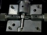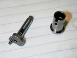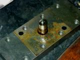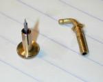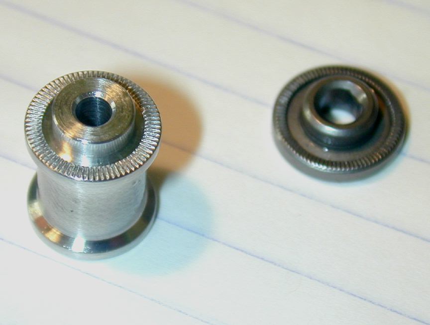 The compression screw is brass, with a fine thread and comparatively large diameter to give a very pleasant "feel". Notice the hollow point. Years of experience with Taipan led to this little touch (and one I first heard from David Owen and have mentioned in these pages before). The center of the contra-piston will probably be slightly raised. So would the tip of a "flat" comp-screw end. The result of these two not-quite flat surfaces registering against each other is a comp-screw that will unscrew under vibration every time. The hollow point allows any slight pip on the contra-piston center to be compensated for, reducing the likelyhood of it unscrewing while the engine is running. As a further precaution, a nylon screw in the cooling head gives a bit more friction and a nice feel. Have another look at the full size photo, paying special attention to the tomy-bar ends. The tommy-bar is 1/16" music wire, with the ends ground spherical on special tooling built by Peter. Not only does this look good, it assists the press fit and provides a nice operator feel.