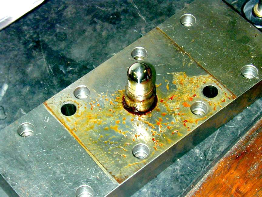 This is the die for the crankcase investment wax. I barely know what we're looking at here—but I'll try to explain. In the middle are the two halves of the die that separate around the case vertical fore-aft center plane. As all parts of the case around this plane are simple curves, these halves will separate from the wax pattern. Note that the halves are keyed together with four dowel pins in the corners. Just inside two of these are two holes which take the clamping screws visible in the upper left corner of the shot. The large, stepped, circular plug at the top enters from the rear of the case. The steps form the inner case cavity and the main journal bore. Beside it is the plug that enters from the bottom and will form the inner surface of the fuel tank cradle. To the immediate right of the die is the plug that forms the cylinder bore. Note that it has three protrubances that will form the Schnurle ports in the inner case walls. Obviously, these would prevent the plug from being removed were it not for the fact that each bump is a separate sliding piece of metal that keys into the plug. This allows the circular part to be slid out leaving the lumps behind. Each can then be moved sideways into the space vacated by the plug, leaving the perfectly finished transfer port indent in the wax. One of these is sitting between the die and the plug. The bottom of the circular plug portion is concave to neatly wrap around the rear entry plug. To the right of that is... I dunno; beats the 'el outa me lieutenant. I've run out of die holes to put plugs in. Note that each plug has a hole in it, and so does the die. The "L" shaped thingies lock the plugs in place and assure their correct positioning. When Peter pulled the die apart, each of these slid freely from its hole, but with a distinct "pop" showing how close the fit.