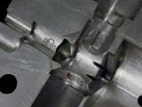 These shots show a close-up of the venturi side of the die, and how the three plugs will sit in their openings. In the left-most, notice the channel below the opening that will support the front of the bore plug. This provides the sprue through which the wax will be injected. This sprue is retained and joined to a spider permitting five cases to be invested together, and finally, provides the entry for the molten aluminium. The shot on the right shows how the plugs enter the die cavity. The Schnurle boost port is uppermost on the cylinder plug and the split lines marking the slide-in piece that permits the plug to slide out independent of the port piece is visible, if you look closely enough.