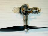 The inlet is an injection moulding that mounts to what we'd usually call the side of the engine with 1-72 cap-head screws. Knowing a thing or two about injection moulding, Peter was very particular in the plastic he wanted for the venturi and backplate. Unfortunately, it was only available from a single supplier in USA, and cost over 100 times what might have been used if this were not a no-compromise engine (oh wait, I forgot; this is NOT a no-compromise engine. yea, right...) but Peter did not weaken, he ordered the plastic he wanted for the job regardless of the absurd cost. Now, about the inlet position. While it can certainly be mounted with the cylinder poking up like an Arden Atom, Peter sees it mounted as a side-winder in a little control liner. This places the venturi upright, with the tank on the outside of the circle for centrifugal feed and would enable a very neat twin-cheek cowling to be fitted. Notice how the tank fill nipple would be above the filled position, so no leaks. There was a short lived British diesel called the Lion that used a similar arrangement of tank and cylinder in the late 40's. and Sparey designed a similar engine during World War II, although both disguised the tank as another cylinder head. Peter's tank is a crystal clear plastic injection moulding, snap fitted and sealed with an O ring. The little embossed ring on the tank allows it to be cut down for shorter engine runs in free flight models (each engine comes with two tanks, so this is not a drastic measure).