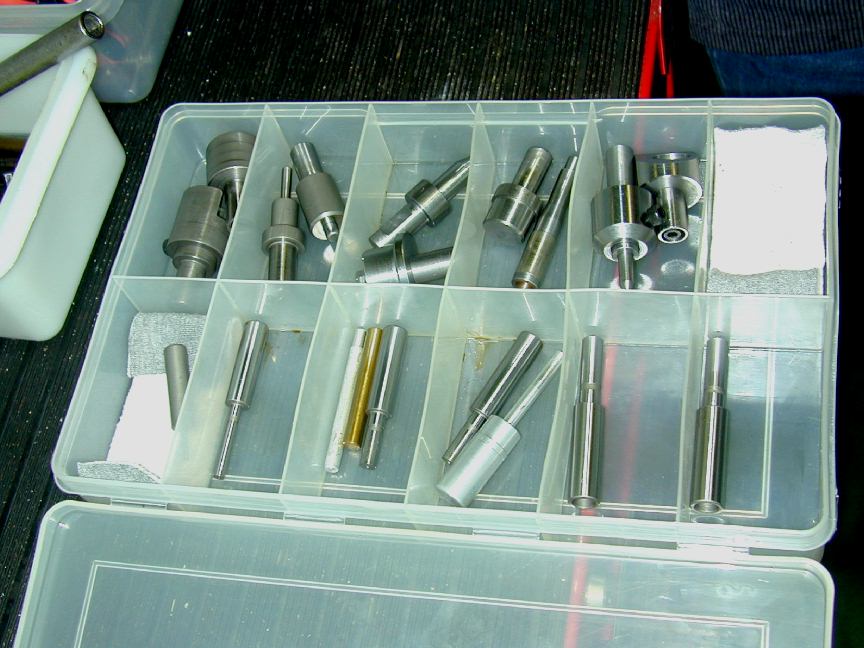 More tooling. This box contains various mandrels and, in the upper left compartment, the very cunning tool mentioned earlier for assembling (permanently!) the piston, rod, and wrist pin. One half of the tool holds and locates the piston via the counter-bored recess on one side of the wrist-pin hole. With the rod positioned and the pin resting in place, the other half presses the pin semi-permanently into the rod. The two halves of the tool come together just as the rod reaches the mid-point of the wrist-pin. No fuss, no mess, no guessing. Incidentally, Peter fully expects owners to dismantle their PB .33, though dismantling the pressed in wrist pin is not something he expects anyone will have a real need to do. As you can see, re-assembly to the same precision that Peter achieves effortlessly would not be a simple matter.
