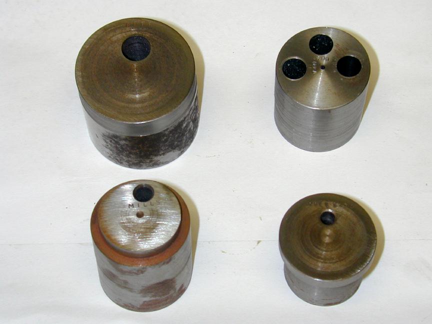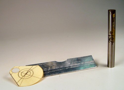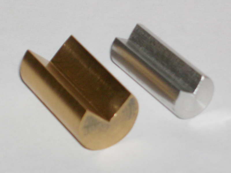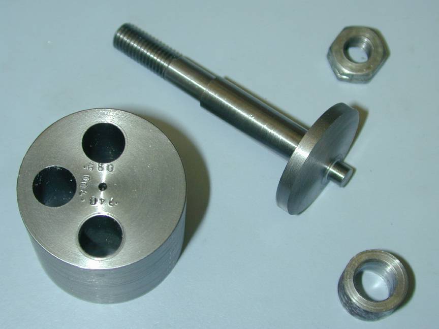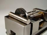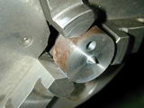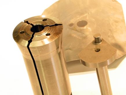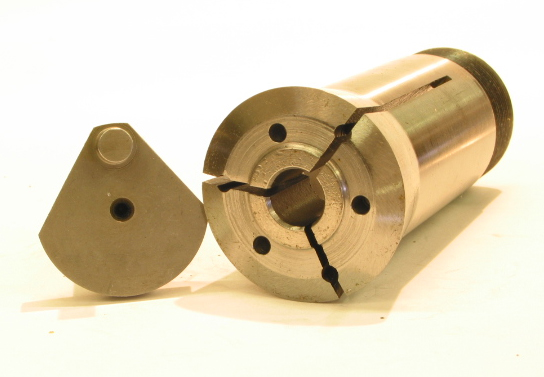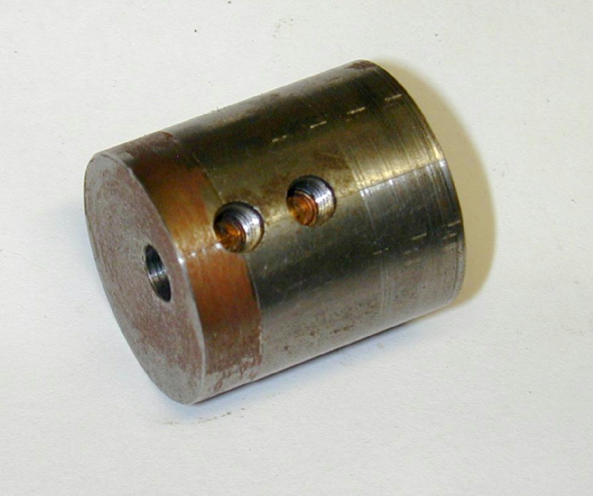 I've always call it the "grub screw", but really, it could use cap head screws, or hex heads come to that (Aside: US readers will most likely know "grub" screws as "set" screws. These are headless screws that can totally enter a tapped hole—hence the 'grub' connection that seems to have come out of England and taken firm root in Australia and New Zealand. End of aside). Two holes are drilled to radially intersect the hole for the shaft in the jig.  These are then tapped for two screws that will, when tightened, hold the shaft in place in the jig. To prevent the tips of the screws from marking the shaft, two plugs of copper are turned to just less than the minor diameter of the thread.  The shaft is inserted and the pads dropped into the holes.  When screws are tightened over the pads, thew will expand slightly and the thread will bite into them, holding them in place when the shaft is later removed. In the Jig seen here, the screws have been taken out so that the slugs are visible (Grubs? Slugs? Sounds like a can of worms to me).
