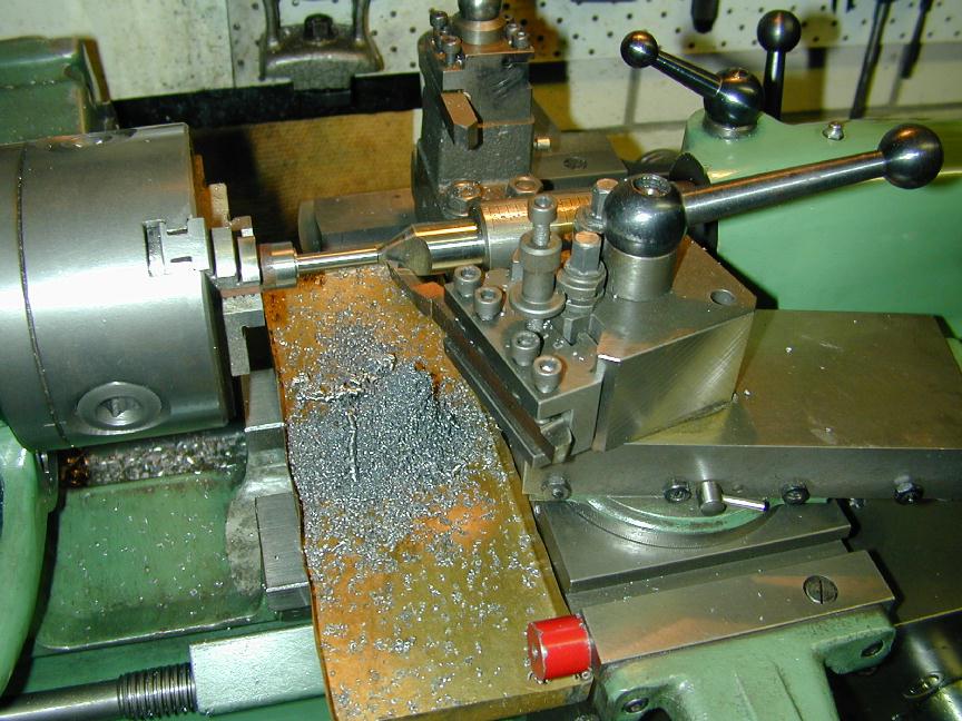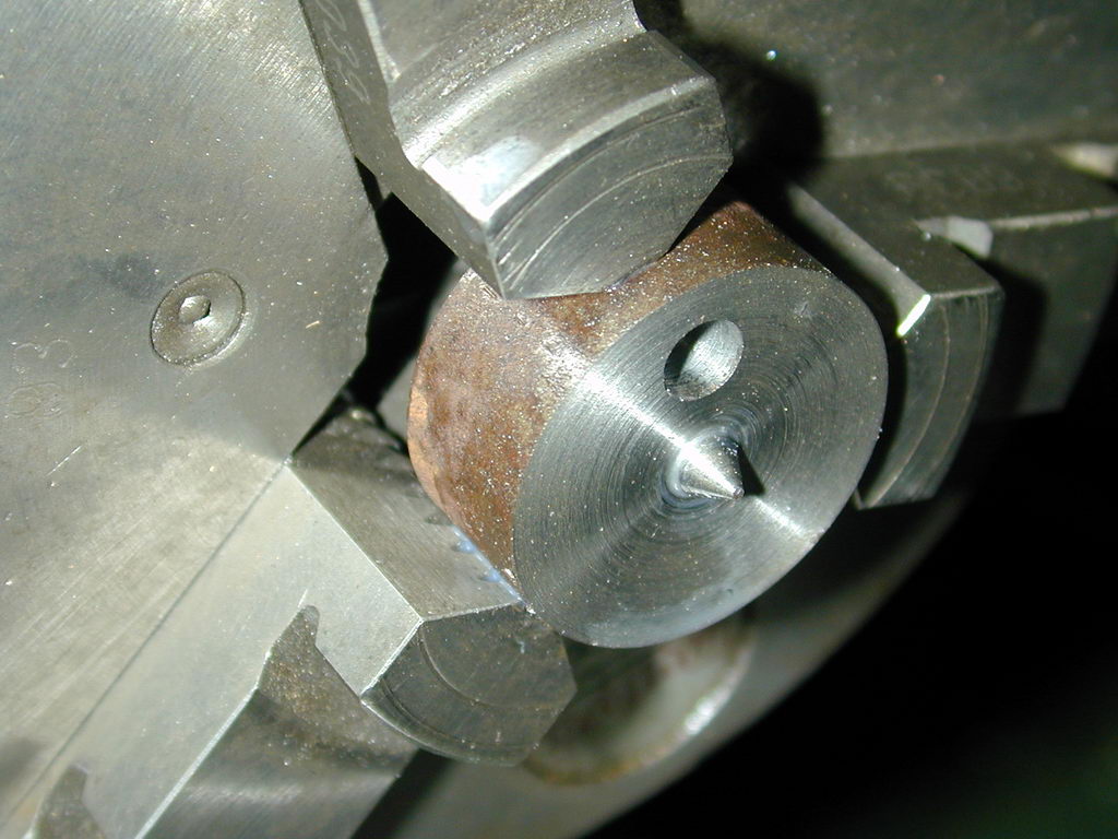 As noted by Dave Sugden, and as can be seen by the photos, the chuck on my Myford can't, as Dave put it, "swallow" the bar, so tailstock support is required while forming the pin. This can be a small center, and if you want, the pin can be made overlength and some or all of the center gently turned away when the pin is complete. If you are working on a small shaft in a large enough chuck, the support will not be necessary.