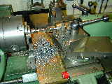 Once the shaft is gripped, the pin is turned. Always have the conrod on hand before doing this unless you are a master machinist able to make pins to a running fit in a hole that does not exist yet (in which case, you will not be reading this drivel!) There are two basic ways to form the pin: making a number of longitudinal passes, or making an even bigger number of radial passes, followed by some longitudinal finishing passes. The former allows more metal removal, but results in an "interrupted cut" that is hard on tool, tooling, and your nerves. I prefer to make radial passes, removing ten to fifteen thou per pass, stopping when the tool just starts to make a fully circular cut. Yes, this is an interrupted cut too, but somehow it seems kinder on the tool and the nerves. Stop making passes when you are within ten thou of the web, then start making fine, longitudinal passes until the theoretical diameter of the conrod big end is reached. The last pass can be used to 'face' the web.