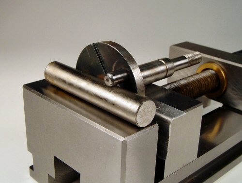 Clamping on the shaft affords the opportunity for a more secure set-up, but requires care not to injure what is probably a finely finished surface. Since cutter and shaft axes will be in-line using this setup, the cutter will be attempting to turn the shaft, opening us to just as much risk as before, unless a positive anti-rotation aide can be employed. Here's how David Owen made the segment cut-offs for the run of GB5's he and Gordon Burford produced.