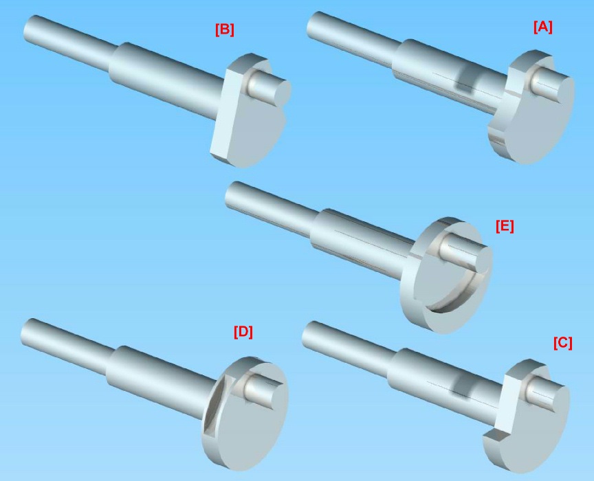 This is a variation on [B], that retains all of the mass on the "heavy" side of the web, so instead of an arc, we have an obtuse angle. The downside is machining is more complex and you need to be careful that the intersection is not so sharp that it induces cracking. The style was used on a lot of old sparkers, and some more recent designs as well. One extreme I saw on an old design reduced the obtuse angle to a right angle![D] Peripheral Crescent Cut-outs