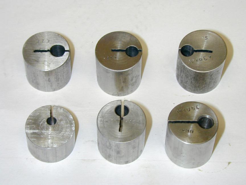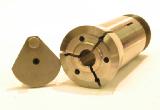 You can let the chuck supply the clamping force by simply sawing partway through the jig, then arranging for the cut to fall half-way between a pair of jaws when tightening up.  All the little jigs seen here do that. The clamping force is now distributed over more area, when compared to the two little copper pads described earlier. For small shafts, I've found this is sufficient to prevent unwanted shifting, if you are careful and make relatively fine cuts. Note too that the jigs have been stamped (in most cases) with what they are for.  I may never make another, but if I do, at least I'll know hat jig to use!