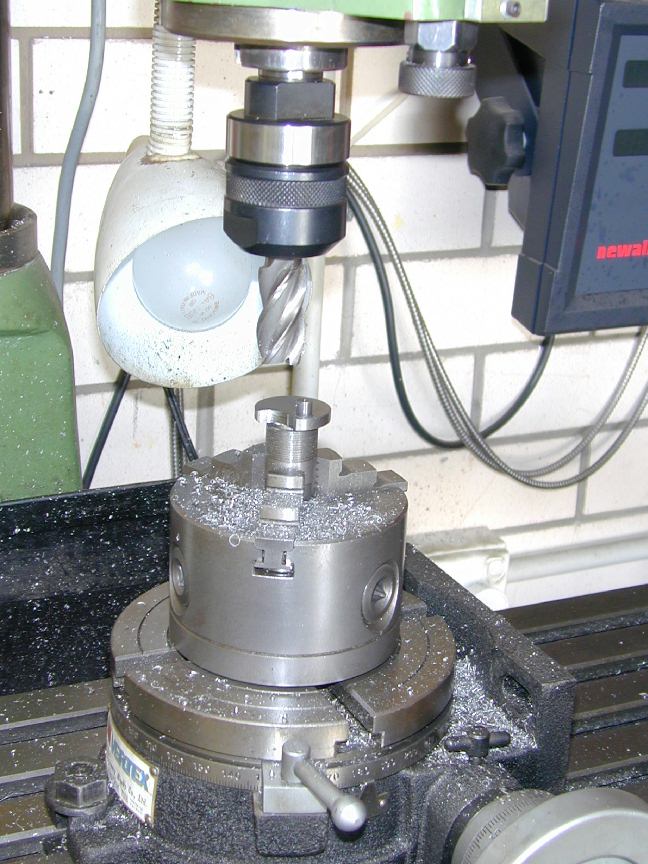 On the plus side, because the shaft can be inserted without removing or upsetting the jig in the chuck, it does lend itself to production use of sorts, and allows the hole to be drilled centrally in the jig and offset in the 4JIC using a wobbler in the hole itself. But I'm lazy; if I can avoid that pin and the hole that must line up with it, I will, and do!