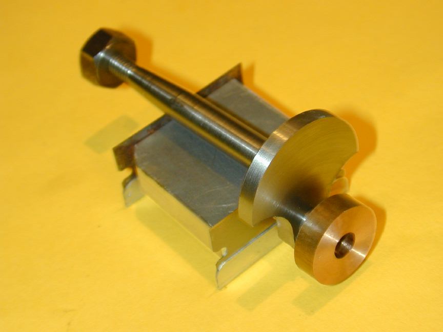 Yet another little task not often looked forward to with any relish is that of cutting the counterbalances into the crankshaft web (con-rod end profiling, 'shaft web cut-outs... is there any task we do look forward to?) I'll offer up my reason for this reluctance. Some parts take a lot of effort to produce, and effort equals time. As the process nears completion, the time investment is large and the opportunity to double the time taken by stuffing up the one in hand reaches a maximum—especially if some final operation requires a less than ideal set-up. Cutting the crank web cut-outs is one of those as it involves an interrupted cut coupled to a problem in workholding. The purpose of cutting a relief in the crankshaft web is to achieve static balance. It is impossible to achieve perfect dynamic balance on single cylinder engines like ours.  The best we can expect is a reasonable compromise by attempting to counter-balance one-half of the reciprocating mass of the engine, namely the piston, wrist-pin, and conrod little-end [LCM].  This is generally achieved by removing metal from the web so that the crankpin will sit horizontal when a weight equal to one-half of the reciprocating mass is acting through the axis of the crankpin. The photo here (from the 5cc Sparey Project shows a shaft set on knife-edges with a donut of the correct weight slipped over the crank-pin. Sadly, even with massive cut-outs, the shaft is not within coo-ee of being balanced. At this point, one can try adding lightness to the piston, but then you run the danger of having an easily distortable piston and subsequent loss of compression. I've had compression punch the crown out of one such light weight piston—a most unnerving occurrence!