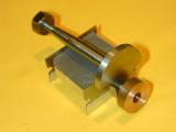 And lastly we come to my currently preferred jig: once the hole is drilled, we're done—how simple can it get!  The jig length is such that the propnut (and a washer, naturally) can be used to draw the shaft very firmly into the jig.  For smaller shafts, a cap head screw into the threaded hole for the stud does the same job. This I've found, provides adequate clamping strength to prevent shaft rotation.