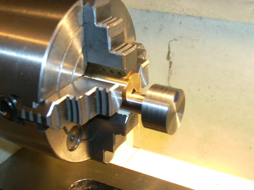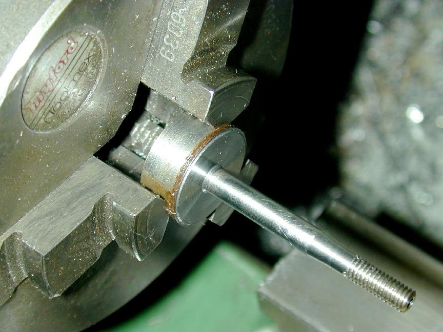 The diameter of the crank web should now be turned to be concentric with the main journal. Just how concentric depends on how you will form the crankpin. If you've left enough protruding from the jaws, good—do it at the same setup. If not, gripping the shaft on the journal in a collet will be fine and produce very accurate results, provided you have an appropriate collet. In desperation, the shaft can be lightly gripped in the 3JSC with a shim of drink-can aluminium used to protect the finish. This can produce a few thou of eccentricity depending on the state of your chuck. Purists might grip in the 4 jaw independent chuck (4JIC) and clock a short, protruding section of journal true. However if you use the offset jigs described below, a thou or two of eccentricity between the web and journal will not matter at all.