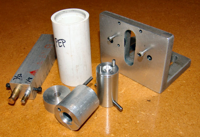 Bert Striegler has added an innovation to the method I've been using that makes a lot of sense and may induce me to change.  The photo here shows the jigs and fixtures Bert made while building his Pepperell.  The Crankpin turning fixtures are the cylinder with the pin and the thick "washer" seen in the lower left of the shot.  First, here's Bert on how it works: