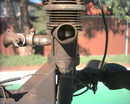 First, despite the rather Westbury Atom Minor-like head and exhaust, it's no Westbury design; ETW did not like long studs for holding head and cylinder to the crankcase. The timer is also too simple for Westbury, being rather Brown-like. Next notice the difference in patina between the rather modern looking throttle and the rest of the engine. I rather suspect that it is a later modification, though still not exactly recent. Finally, the castings: it's hard to tell under all the grunge, but they appear nicely made. They may not even be sand cast, though it's hard to tell. Except for the modern throttle, the design in general is very 1930's, as is the size. That was a period when the skill of home-grown casting was not as unusual as it is today, so it is possible that we are looking at a one-off, home-built. If anyone recognizes it, we sure like to know.