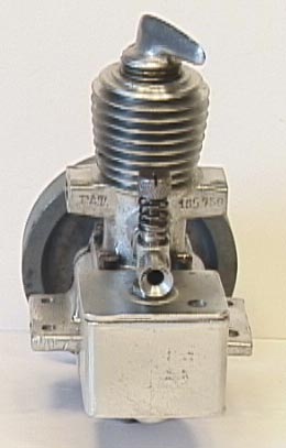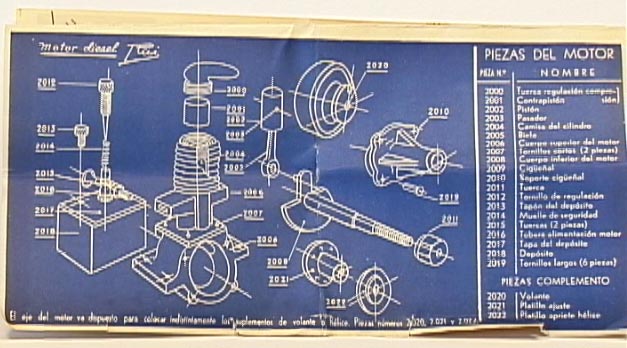 The lettering on the leaflet is a bit of a give-away to those who recognize Spanish when they see it. The most outstanding feature of the engine is the compression screw that reminds me of the fins on a Buck Rogers rocket ship. This heroic cast handle may make it easy to turn--until it heats up--and it could be a vulnerable item in a prang.