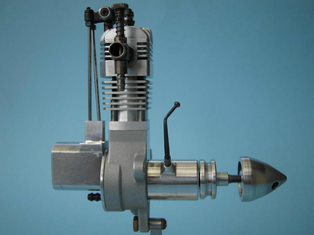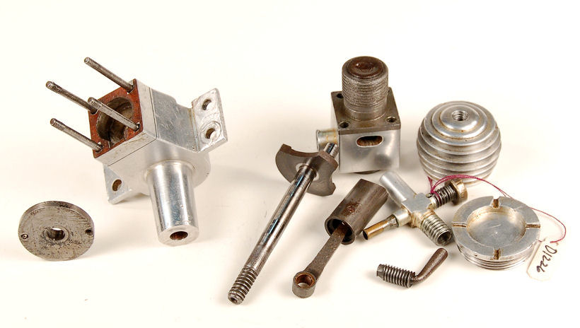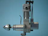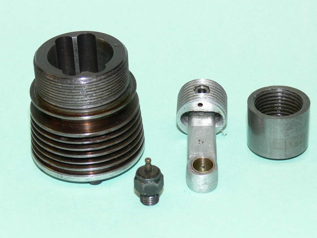 The steel, screw-in cylinder has a very thick lower section, which has four drilled, internal transfer flutes. These are flanked by twin exhaust slits, similar to a Cox engine. The piston itself is a fairly heavy cast iron slipper, threaded for an aluminium carrier which encloses the wrist-pin.