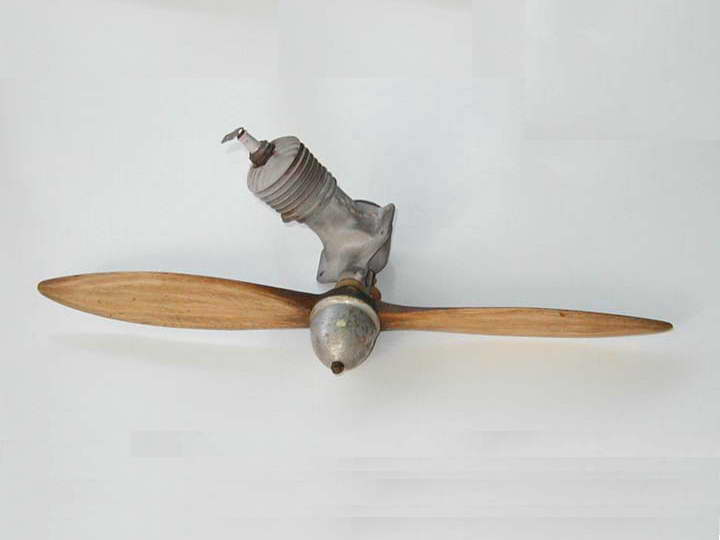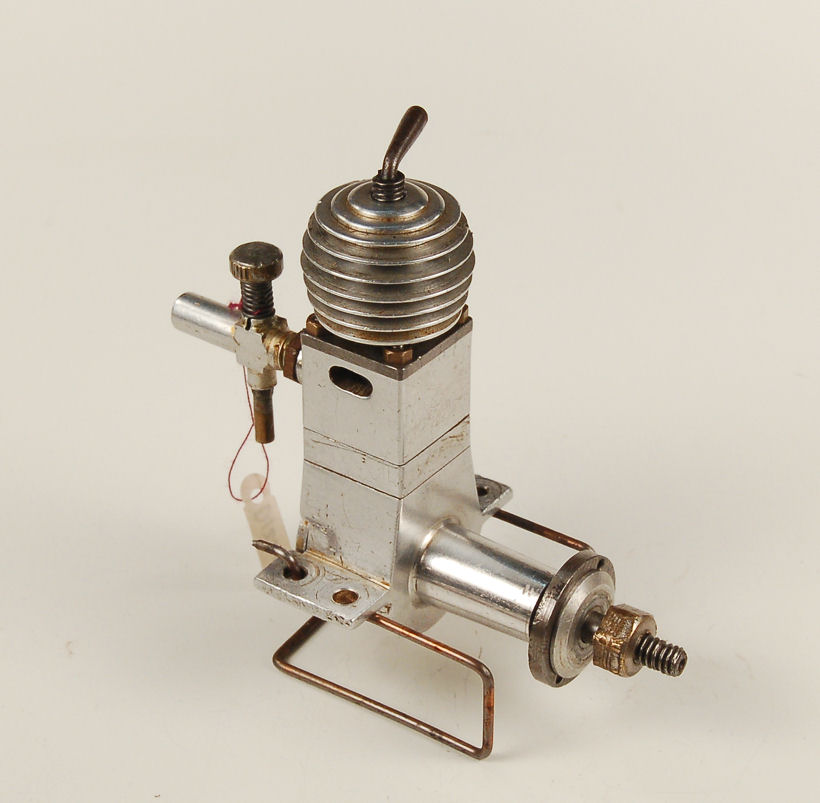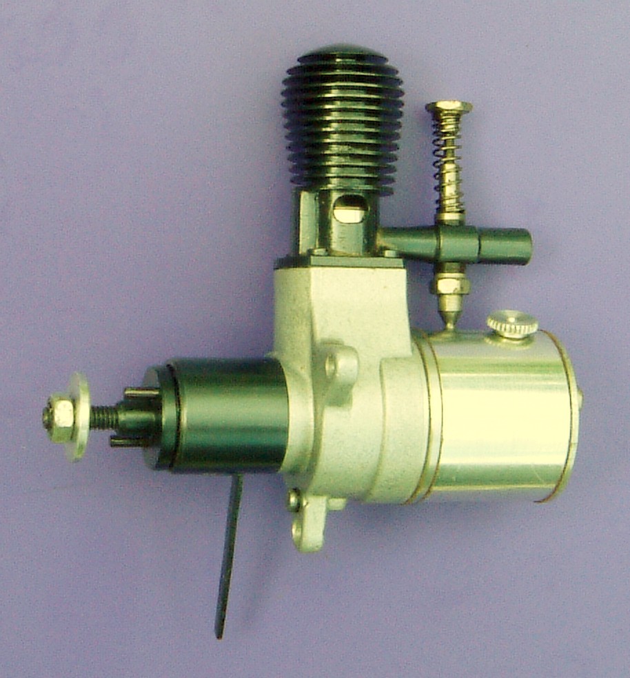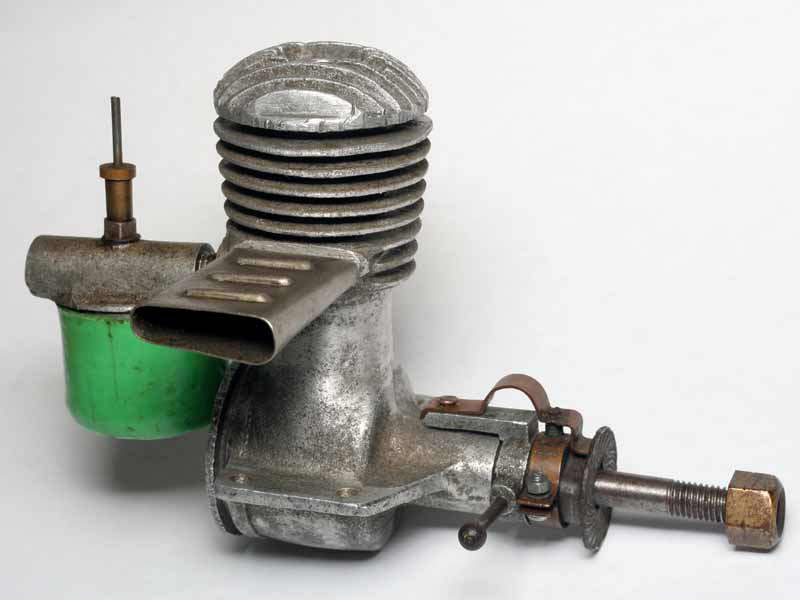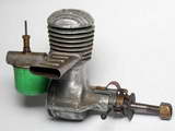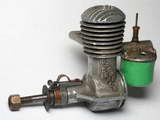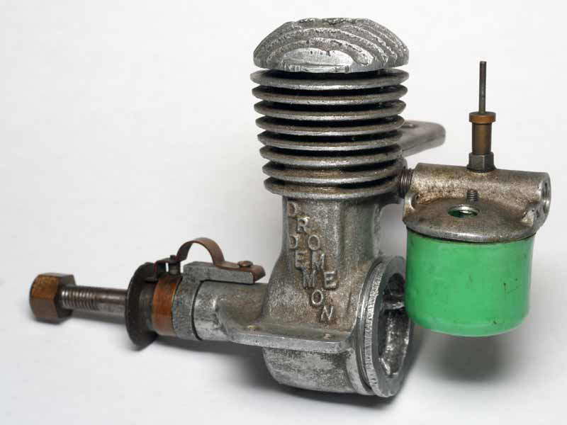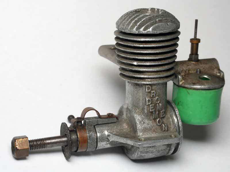 The engine is an English-made, pre-WWII, 6cc sparkie that fits in the "slag" category in that it featured—if that's the word—a pressed steel piston running (briefly) in an aluminium bore. The Drome part of the name derives from the maker, Model Aerodrome of 141 Stratford Road, Birmingham, England. The engine with the green tank is close to original, but there are variations that can also claim to be original as the engine was sold ready to run, and as a kit which is the "Beware" part of the cryptic title: the engine you buy may be a kit with all sorts of non-factory changes. OFW Fisher's book has a paragraph stating that there were two versions: the liner-less Mk I and a Mk II with a steel liner. Fisher is usually reliable, but as we can find no corroborating evidence, it could be that Fisher saw a home-made version that had been thoughtfully made with a liner. Another example has been seen that has no liner, but does have a cast-iron ring!