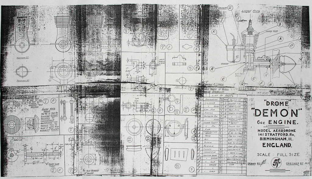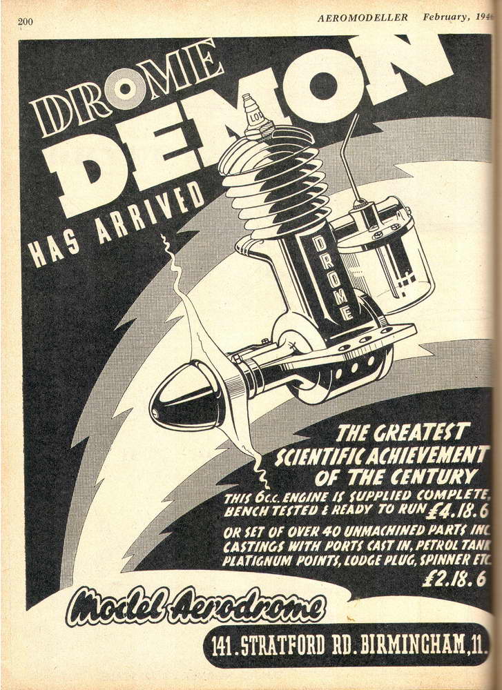 The last piece to add to the puzzle is the only known advertisement for the Drome Demon to appear in the Aero Modeller. Now leaving aside the rather ambitious claim of the Demon being "The Greatest Scientific Achievement of the Century", note the date: February 1946. It could be that this ad was placed to test the water and see if they should revive an engine that they'd made years ago, or it just could indicate the introduction of the engine. Saying that the "Drome Demon Has Arrived" certainly suggests a product launch. If so, both Clanford and Fisher have the date rather badly wrong. It is really too bad that no date appears on Ken's plan.