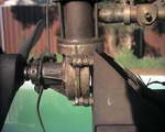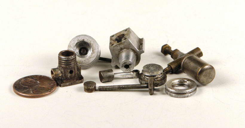 The inside of the screw-on cylinder muff was threaded with a bottoming tap and is misaligned, The tiny piston has a 1mm brass wrist pin. The shaft, by the way, is an assembled thing with the drive disk being swedged on with a clockmakers tool that upsets a "ring" of metal against the shaft - sort of a hollow punch. The crankpin is swedged into a blind hole in the crankweb in the same manner. The tank is a small jewelers oiler container, but the "needle valve" is not a needle, not a pin, but a simple bolt with a 45 degree cone on one end that seats into a fuel tube roughly the same diameter as the air inlet tube.