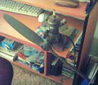 We have no idea what this is. As you can see by comparison of the hand-carved prop and the computer keyboard in the background, this is a rather large spark ignition engine. It is currently living in Sydney, Australia, and probably originated there. I've only seen the photos below, so what follows is merely what can be guessed from them.