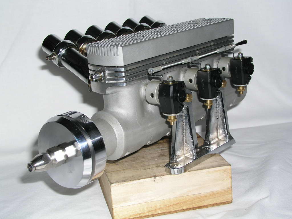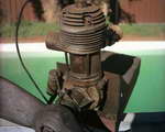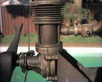 Readers of the Model Engineer may recall this engine from Malcolm Stride's account of the 74th Model Engineering Exhibition that appeared in issue #4248 of 27 May-9 June, 2005. From the name embossed in the case we can assume it is an Eldon. It appears to be an in-line, six cylinder two-stroke. The water cooled head and flywheel argue for a nautical application and the location of the Perry carbs argues for side port induction (imagine three Taplins joined end to end), although shaft rotary is also possible. The displacement of each cylinder is 10cc.